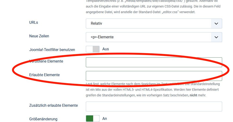 Wenn man nach unten scrollt, findet man die Felder "verbotene Elemente" und "erlaubte Elemente". Wenn man nun iframes erlauben will, muss man den Eintrag iframe mit dem Komma davor in "verbotene Elemente" löschen. Man muss es nicht bei "erlaubte Elemente" eintragen.