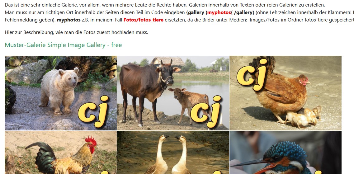 Man muss nur am richtigen Ort innerhalb der Seiten diesen Teil im Code eingeben {gallery }myphotos{ /gallery} (Wichtig: ohne Lehrzeichen innerhalb der Klammern! Hier würde es eine Fehlermeldung geben). myphotos z.B. in meinem Fall Fotos/fotos_tiere ersetzten, da die Bilder unter Medien:  Images/Fotos im Ordner fotos-tiere gespeichert sind.